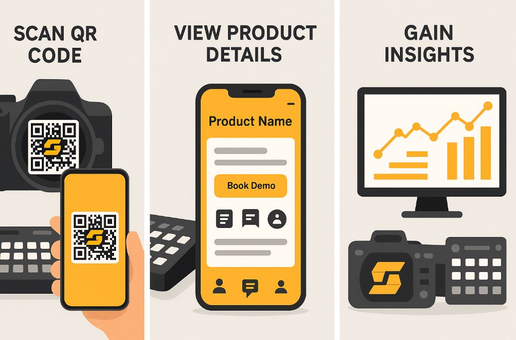 With Skedly, each product you list automatically receives a unique, smart QR code. Exhibitors simply display that code—on a screen, a placard, or the product itself—and let the visitor take the lead.